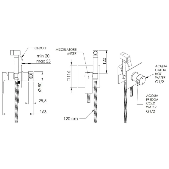 Душевой шланг, Душевая лейка, Подключение для душевого шланга с держателем, Скрытая монтажная часть, Смеситель