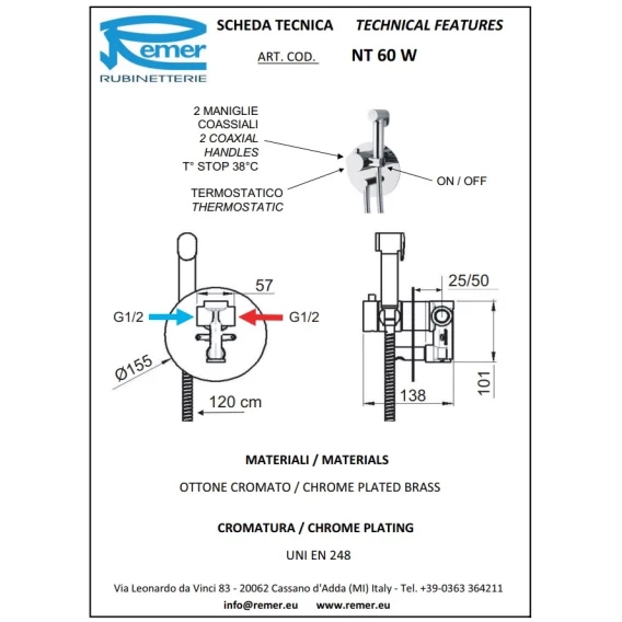 Гигиенический душ Remer Minimal NT60W с термостатом, хром