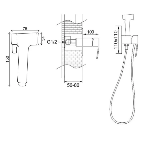 Душевой шланг, Душевая лейка, Держатель для душевой лейки, Скрытая монтажная часть, Смеситель