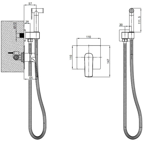 Душевой шланг, Душевая лейка, Подключение для душевого шланга с держателем, Скрытая монтажная часть, Смеситель