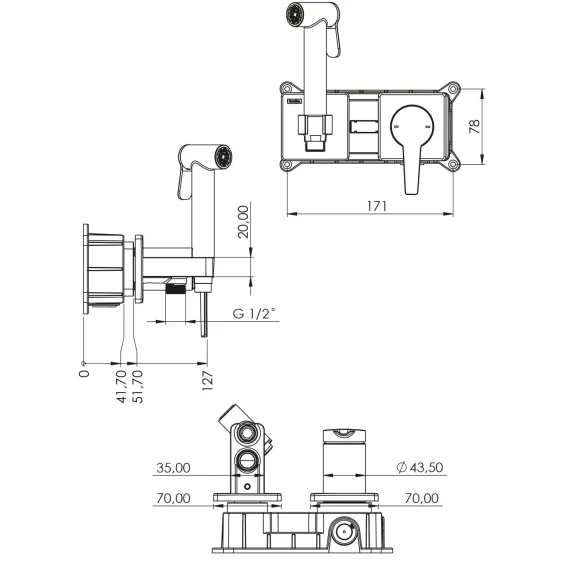 Душевой шланг, Душевая лейка, Подключение для душевого шланга с держателем, Скрытая монтажная часть, Смеситель