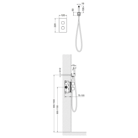 Душевой шланг, Душевая лейка, Подключение для душевого шланга с держателем, Скрытая монтажная часть, Термостат