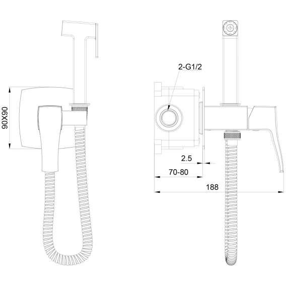 Душевой шланг, Душевая лейка, Подключение для душевого шланга с держателем, Скрытая монтажная часть, Смеситель
