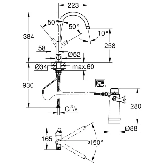 • диапазон поворота 150°