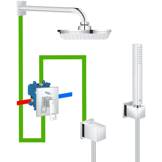 Душевой шланг, Душевая лейка, Держатель для душевой лейки, Подключение для душевого шланга, Верхний душ, Скрытая монтажная часть, Смеситель, Кронштейн