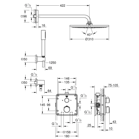 Душевой шланг, Душевая лейка, Держатель для душевой лейки, Подключение для душевого шланга, Верхний душ, Скрытая монтажная часть, Кронштейн, Термостат