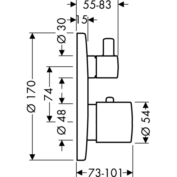 Термостат со встроенным запорным вентилем. СМНаружная часть, в набор входят: рукоятка, гильза, розетка, керамический вентиль, термоэлемент.Предустановленное ограничение температуры горячей водыРасход воды 26 л/мин при 3 барахPекомендуем: скрытая часть ibox universal (01800180)