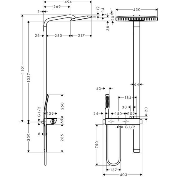 Душевой шланг, Душевая лейка, Держатель для душевой лейки, Полочка, Верхний душ