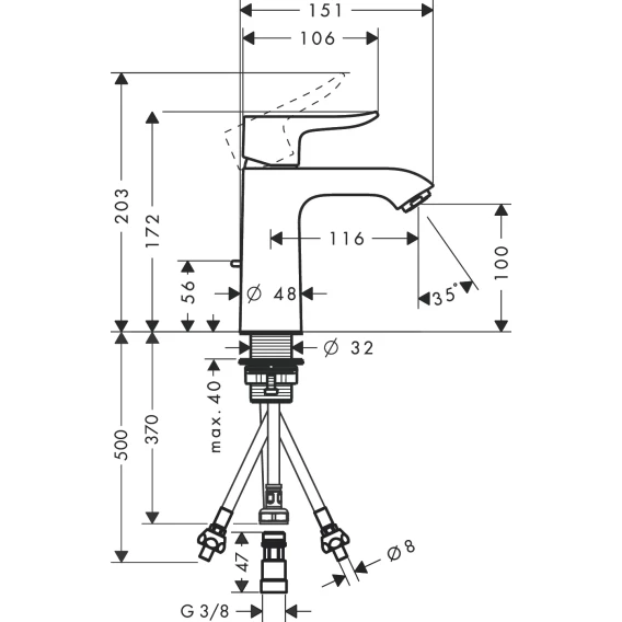 • состоит из: однорычажный смеситель для раковины, сливной набор.