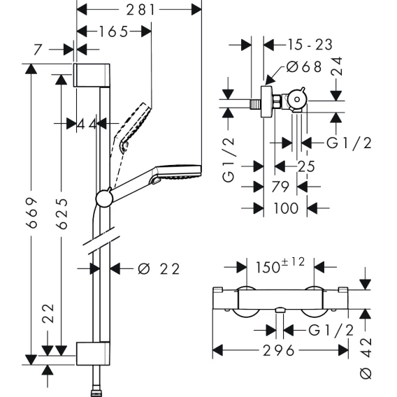 • состоит из: ручной душ, термостат для душа, душевая штанга, держатель, шланг для душа