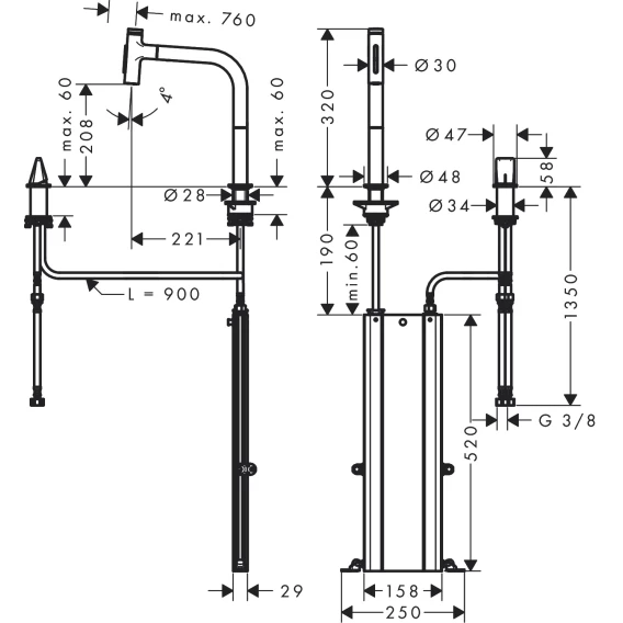 • состоит из: кухонный смеситель, однорычажный, на 2 отверстия, устройство управления, корпус для шланга
