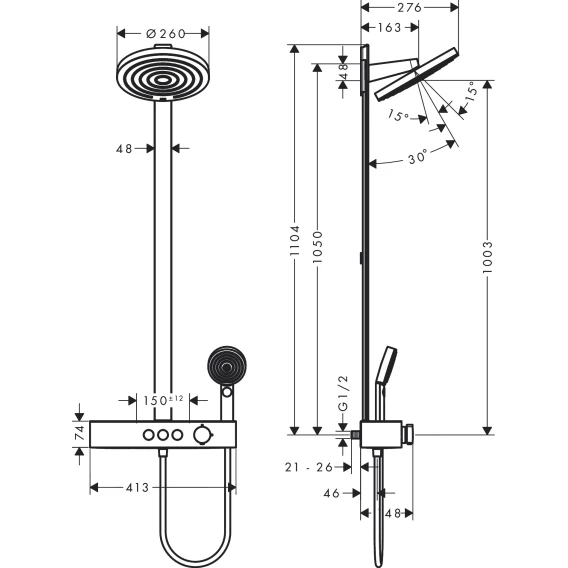 • размер душевой лейки верхний душ: 260 мм