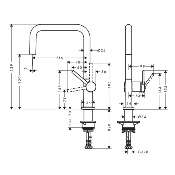 • угол поворота излива: регулировка на 4 уровня 60 °, 110 °, 150 ° или 360 °