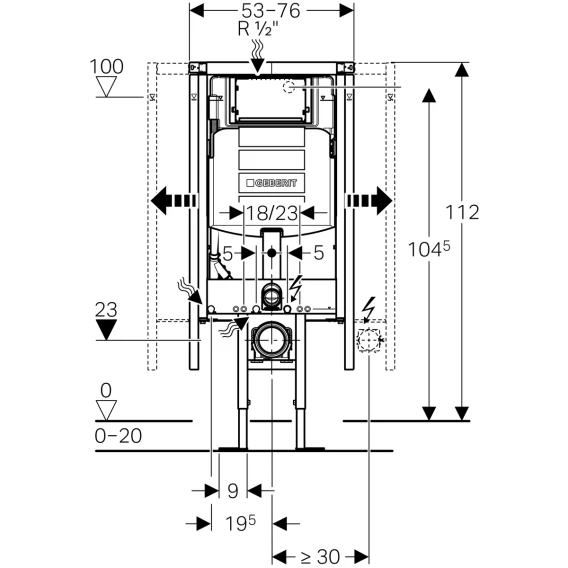 Характеристики Help IconsСамонесущая pама с порошковой окраскойНастенный монтаж варьируется: 30°–60°, с обеих сторон раздвигается на 10 смВстроенная панельная обшивка впереди, сверху и по бокам съемнаяМинимальные и максимальные размеры для опорной поверхности: B = 56/76 см, T = 28/38 см, длина отвода = 39,6/53,7 смРама, подходит для нестандартного санфаянса (при стойкой к нагрузкам облицовке стен)Стойка оцинкованнаяСтойки с возможностью перемещения 0–20 смСтойка сцеплена для бокового отвода канализационной трубыСоединительный патрубок может монтироваться без использования инструментовШумопоглощающее крепление соединительного патрубкаСмывной бачок скрытого монтажа с фронтальной установкойСмывной бачок скрытого монтажа с противоконденсатной оболочкойПри заводской установке возможен немедленный последующий смывМонтаж и сервисное обслуживание смывного бачка скрытого монтажа не требуют использования инструментовПодвод воды сзади или сверху по центруЗащитная крышка окна технического обслуживания защищает от влаги и грязиЗащитная крышка окна технического обслуживания с возможностью укорачиванияОснащен трубкой подвода воды для подсоединения унитазов-биде Geberit AquaCleanС возможностью крепления для электропитания
