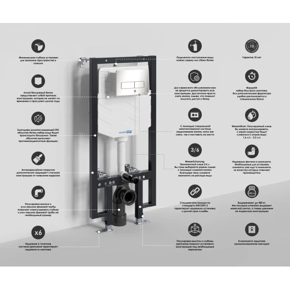 Крепление, Кнопка смыва, Инсталляционная система, Звукоизолирующая прокладка
