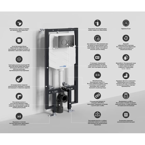 Крепление, Кнопка смыва, Инсталляционная система, Звукоизолирующая прокладка