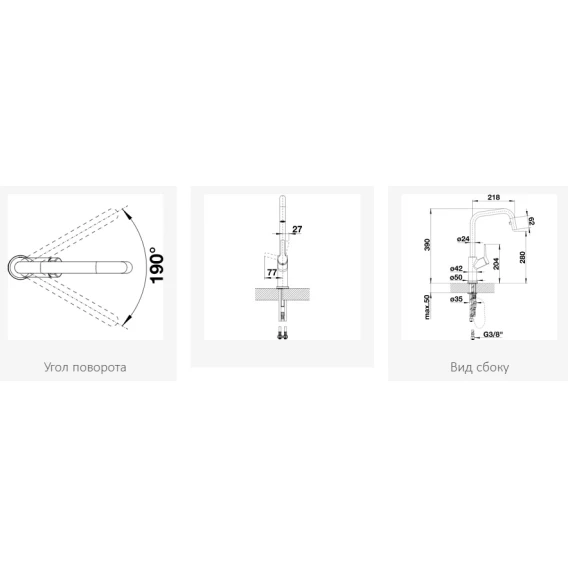 • Угол поворота излива 190°