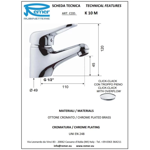 Кран для холодной воды с донным клапаном Remer Kiss K10M