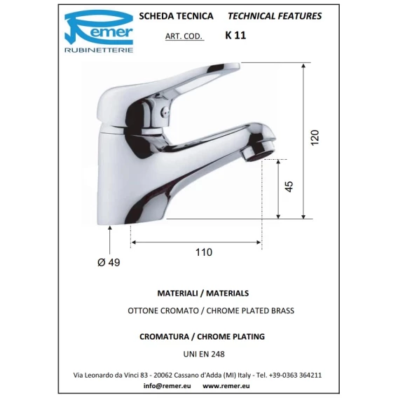 Смеситель для раковины без донного клапана Remer Kiss K11
