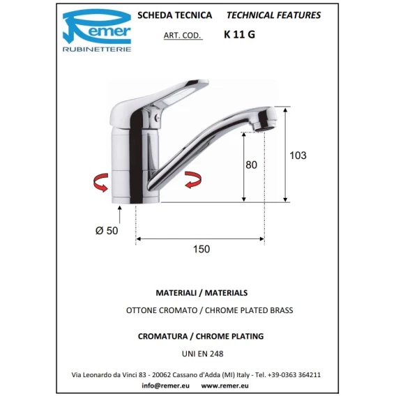 Смеситель для раковины без донного клапана Remer Kiss K11G