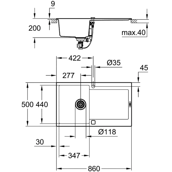 • требуемый размер отверстия в столешнице для установки мойки: 840 x 480 мм