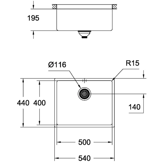 • Внешний радиус: R16 (монтаж под столешницу)/R3 (вровень со столешницей), внутренний радиус чаши: R15