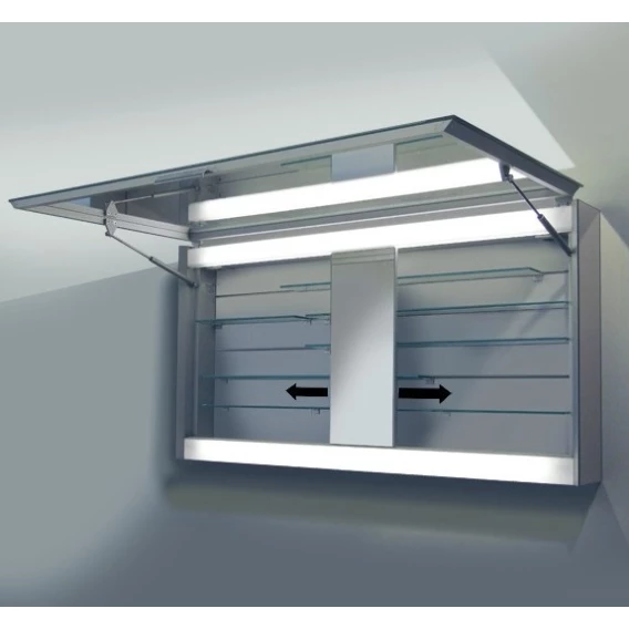 1 поднимающаяся дверцас хрустальным зеркалом с двух сторон,зеркальное покрытие боковых стенок,подсветка люминесцентными лампами 2 x 21 Вт T5EEK: A+, 2 x 23 kWh/1000h