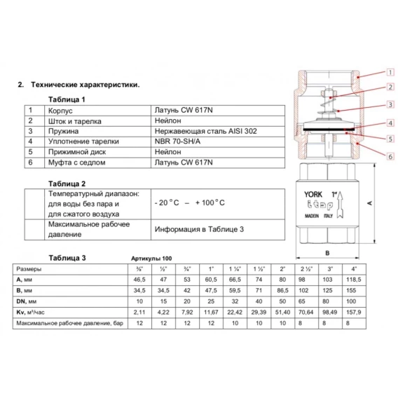 Клапан обратный пружинный муфтовый YORK с пластиковым седлом предназначен для предотвращения обратного тока жидкости или газов в пределах допустимых значений по температуре и давлению