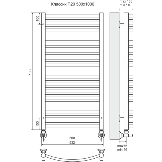 Полотенцесушитель водяной 1006x532 подключение нижнее Terminus Классик П20