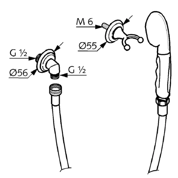 Душевой шланг, Душевая лейка, Держатель для душевой лейки, Подключение для душевого шланга