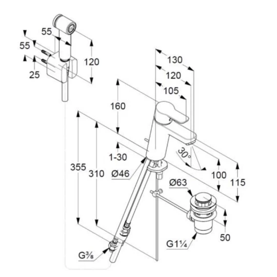 Смеситель для раковины с гигиеническим душем с донным клапаном Kludi Pure&Easy 372590565