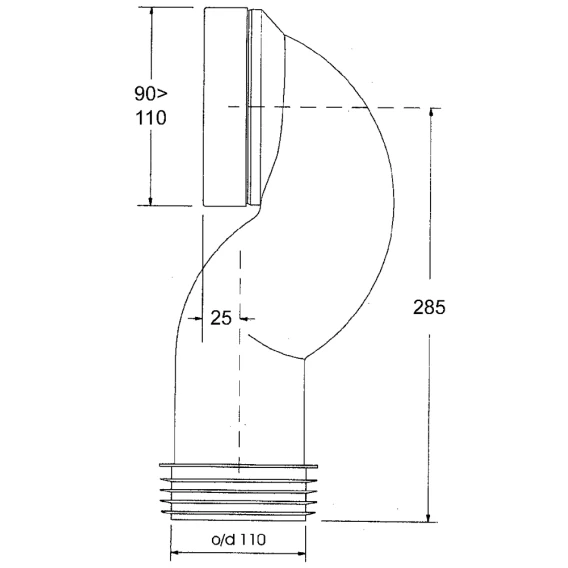 Фановая труба (L285мм) под углом 90 ° с прокладкой; вход на 90-110мм, выход вставляется внутрь 4"/110мм трубы
