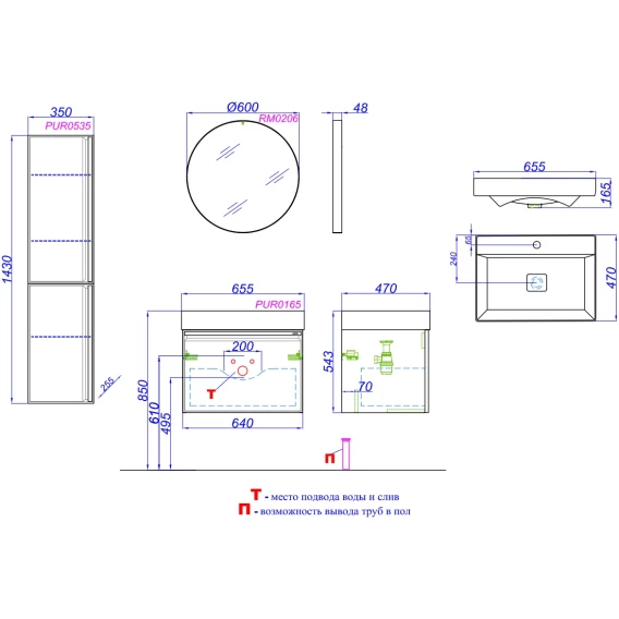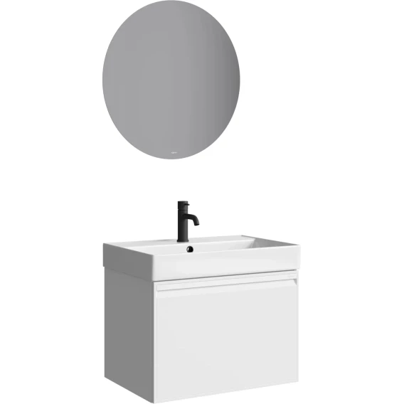 Механизм доводчика, Ящик, LED подсветка, Ручка, Сенсорный выключатель, Зеркало, Тумба под раковину, Раковина