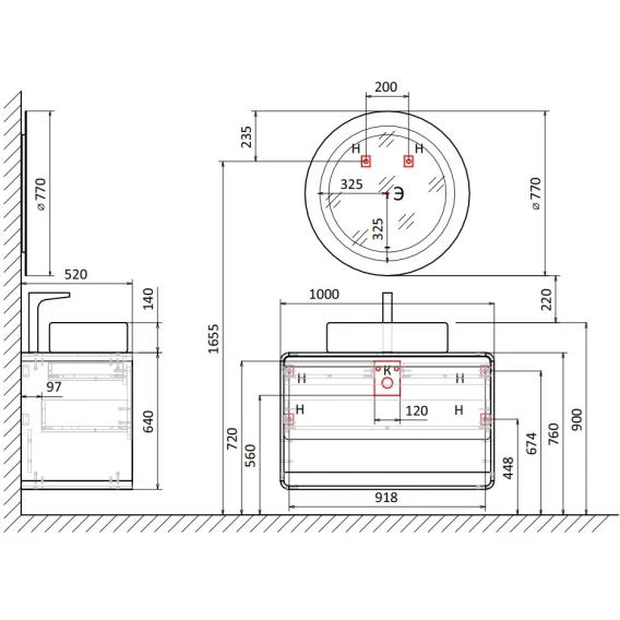 Механизм доводчика, Ящик, Полочка, LED подсветка, Сенсорный выключатель, Зеркало, Столешница, Тумба под раковину, Раковина