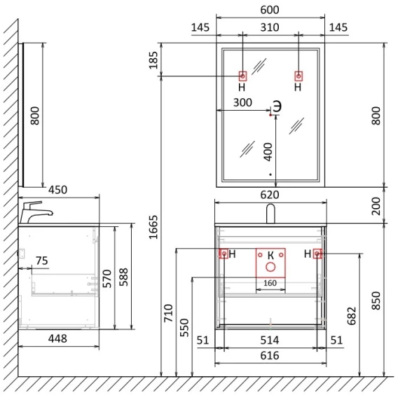 Механизм доводчика, Ящик, Полочка, LED подсветка, Сенсорный выключатель, Электронные часы, Зеркало, Тумба под раковину, Раковина