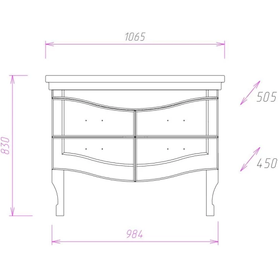 Прекрасная в своей индивидуальности напольная тумба для ванной комнаты Onika Адель 105 - беспроигрышный компромисс между красотой и функциональностью, классической внешностью и современным содержанием.Необычная форма безупречно-белого глянцевого фасада удивительным образом гармонирует с яркой фурнитурой цвета состаренного золота визуально расширяет пространство и наполняет его светом.4 больших выдвижных ящика скрытого монтажа с доводчиками и полным выдвижением - отличное место для хранения всех необходимых в ванной комнате вещей.Фасад и боковины тумбы выполнены из ЛЛМДФ, покрытой стойкой глянцевой эмалью, устойчивой к механическим воздействиям, перепадам температур и высокой влажности.4 изогнутых ножки и 4 фигурных ручки цвета бронзы идут в комплекте с тумбой.Размеры тумбы без учета раковины и ножек: 98х45х54 см.