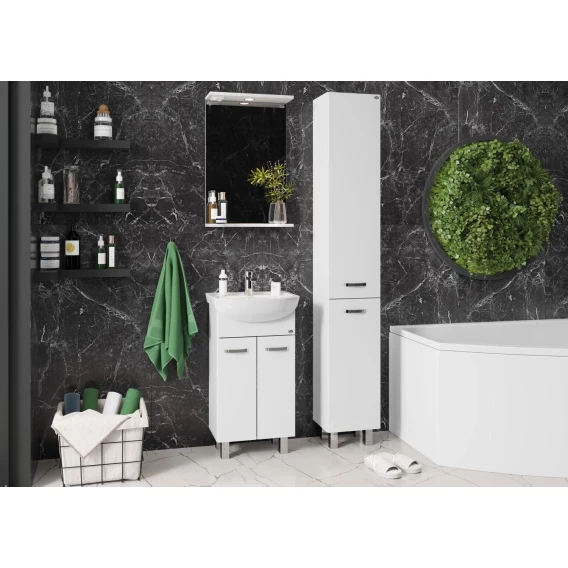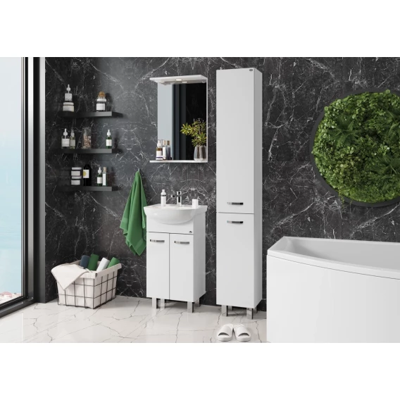 Напольная тумба для ванной комнаты Onika Коралл 47 - это идеальное сочетание минимализма, функциональности и цены.Строгие формы без декора и стильные хромированные ручки на двух распашных дверях, скрывают просторное внутреннее пространство с полкой для размещения необходимых бытовых принадлежностей.Корпус тумбы выполнен из ЛДСП, фасад - из ЛМДФ в пленке, устойчивых к механическим воздействиям, перепадам температур и высокой влажности.Две хромированных ручки и три ножки (2 декоративных хромированных и 1 пластиковая) идут в комплекте с тумбой.