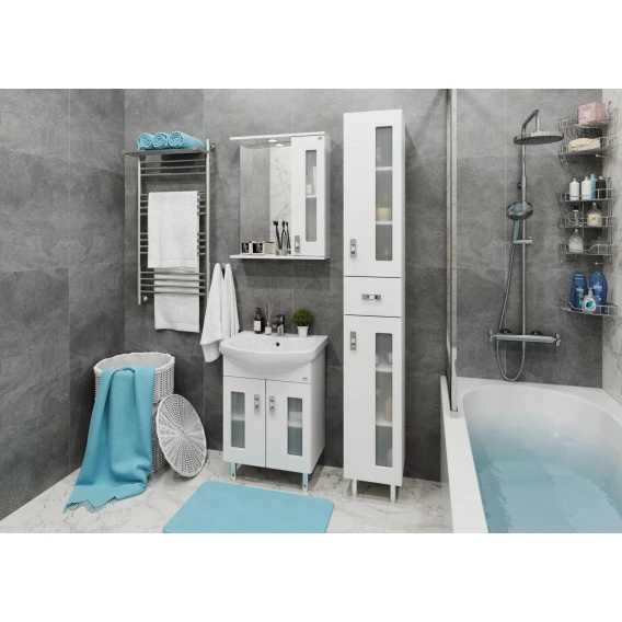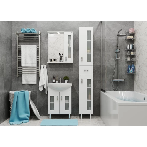 Стильная и красивая напольная тумба Onika Кристалл 55 сможет гармонично вписаться в любой интерьер.Белоснежный глянцевый цвет фасада в сочетании со вставками из матового стекла и хромированными ручками необычной формы придадут ванной комнате ощущение свежести, чистоты и уюта.За распашными дверцами, снабженными системой плавного закрывания и украшенными хромированными ручками, скрывается просторное внутреннее пространство, разделенное горизонтальной полкой: оно служит для размещения необходимых бытовых принадлежностей.Корпус тумбы выполнен из ЛДСП, фасад - из ЛМДФ в пленке, устойчивых к механическим воздействиям, перепадам температур и высокой влажности.Две хромированных ручки и три ножки (2 декоративных хромированных и 1 пластиковая) идут в комплекте с тумбой.