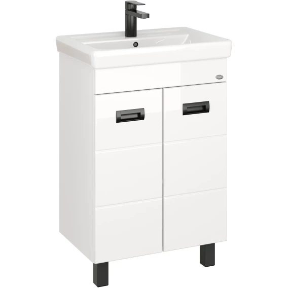 Напольная тумба для ванной комнаты Балтика-Квадро Black 60 - это простые функциональные формы и яркий акцент в любом дизайне.Глянцевый белый цвет фасада контрастирует с черной матовой фурнитурой, а ненавязчивая горизонтальная фрезеровка дополняет образ стильной и современной мебели.За распашными дверцами с системой плавного закрывания расположено вместительное отделение, разделенное на две части горизонтальной полочкой, которое станет удобным местом для хранения различных бытовых принадлежностей.Корпус тумбы выполнен из ЛДСП, фасад - из ЛМДФ в пленке, устойчивых к механическим воздействиям, перепадам температур и высокой влажности.Ручки врезаны в фасады. Ножки (2 декоративных и 1 пластиковая) с регулировкой по высоте идут в комплекте с тумбой.2 декоративных и 1 пластиковая ножки с регулировкой по высоте идут в комплекте с тумбой.