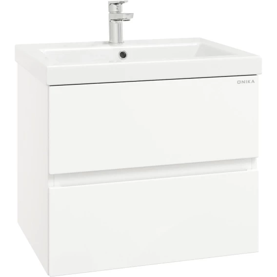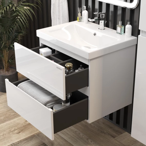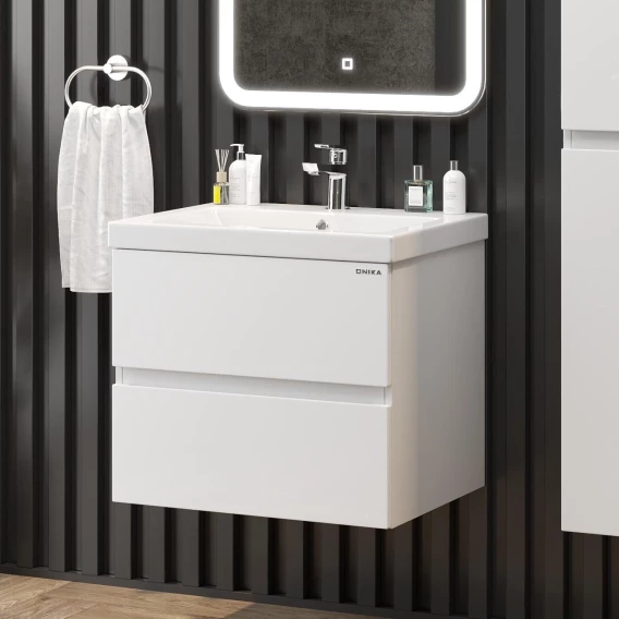 Подвесная тумба для ванной комнаты Onika Эвада 60 сочетает в себе стильный минималистичный дизайн, белую глянцевую поверхность и высочайшее качество исполнения. Два вместительных ящика с направляющими скрытого монтажа с доводчиками помогут организовать пространство в ванной комнате и компактно разместить необходимые вещи.Подвесная конструкция значительно упрощает процесс уборки в ванной комнате, а ручки, изящно интегрированные в фасады, позволяют сделать эксплуатацию более удобной и практичной.Тумба выполнена из ЛМДФ и ЛДСП, покрытых эмалью, устойчивой к механическим воздействиям, перепадам температур и высокой влажности.Подвесы для крепления тумбы - в комплекте.