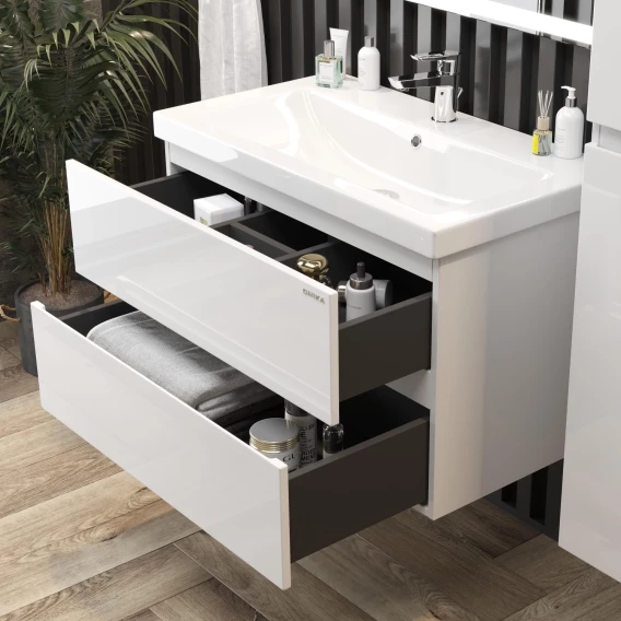 Подвесная тумба для ванной комнаты Onika Эвада 80 сочетает в себе стильный минималистичный дизайн, белую глянцевую поверхность и высочайшее качество исполнения. Два вместительных ящика с направляющими скрытого монтажа с доводчиками помогут организовать пространство в ванной комнате и компактно разместить необходимые вещи.Подвесная конструкция значительно упрощает процесс уборки в ванной комнате, а ручки, изящно интегрированные в фасады, позволяют сделать эксплуатацию более удобной и практичной.Тумба выполнена из ЛМДФ и ЛДСП, покрытых эмалью, устойчивой к механическим воздействиям, перепадам температур и высокой влажности.Подвесы для крепления тумбы - в комплекте.