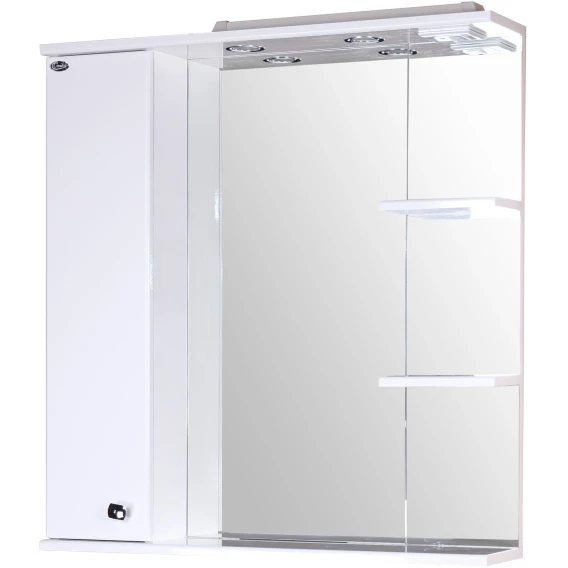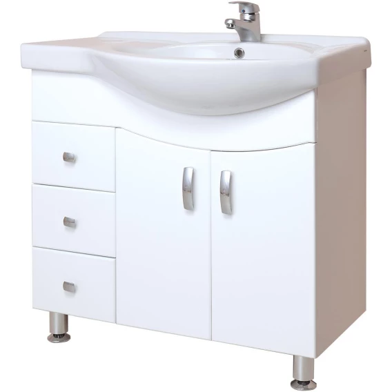 В тумбе Onika Эльбрус 82 белоснежный глянец фасада подчеркивается оригинальной хромированной фурнитурой и сложной изысканной геометрией линий.Современный функционал тумбы позволяет удобно расположить все необходимое: две распашных двери справа скрывают большое отделение для крупных предметов, а три выдвижных ящика слева созданы для хранения небольших вещей.Ящики тумбы оснащены направляющими полного выдвижения, а дверцы снабжены системой плавного закрывания.Корпус тумбы выполнен из ЛДСП, фасад - из ЛМДФ в пленке, устойчивых к механическим воздействиям, перепадам температур и высокой влажности.Пять хромированных ручек и четыре ножки (2 декоративных хромированных и 2 пластиковых) идут в комплекте с тумбой.