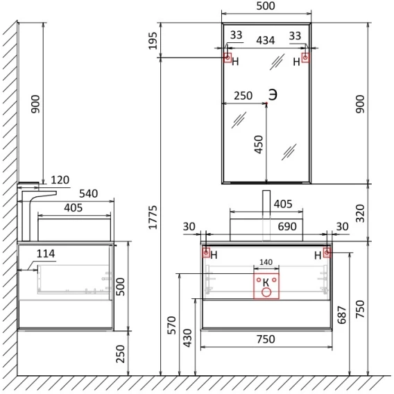 Механизм доводчика, Ящик, Полочка, Ручка, Зеркало, Столешница, Тумба под раковину, Раковина