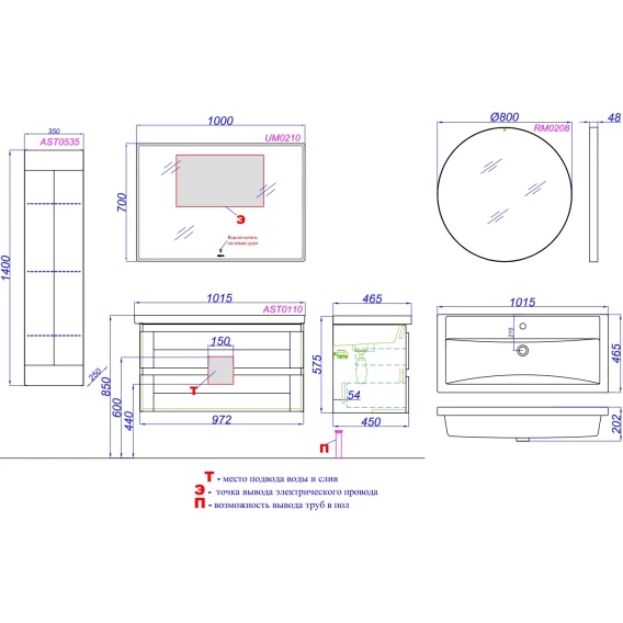 Механизм доводчика, Ящик, Зеркало, Тумба под раковину, Раковина