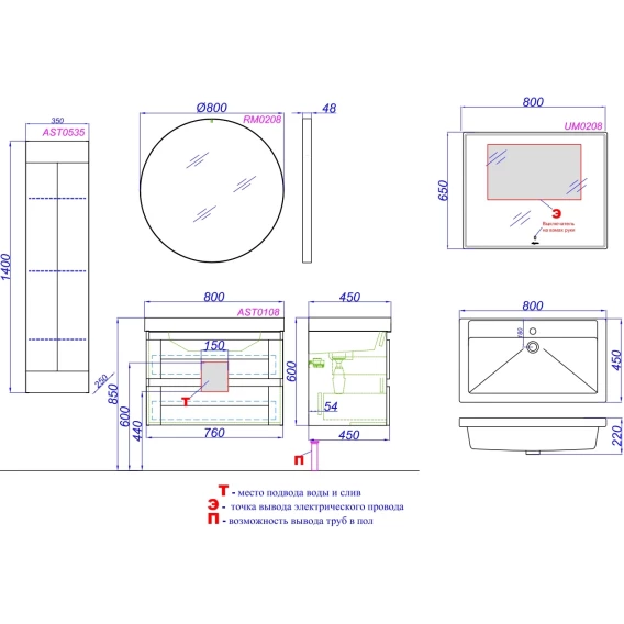 Комплект мебели дуб давос 80 см Aqwella Astrid AST0108DD + FST80SLWB01 + RM0208BLK