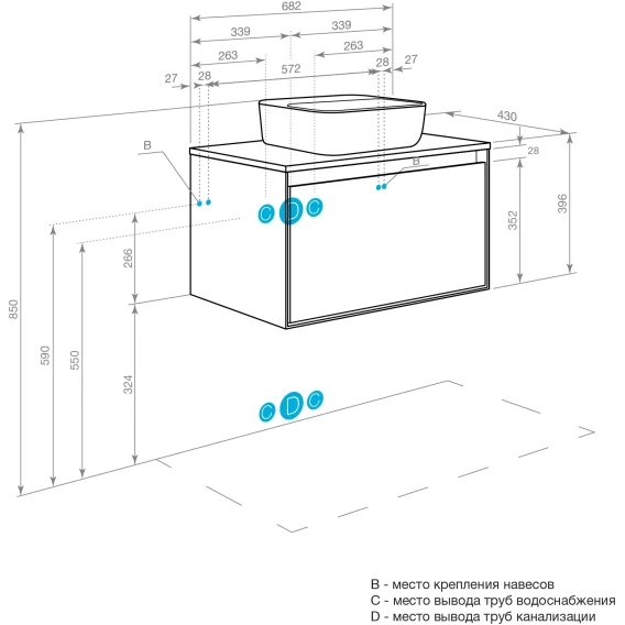 Механизм доводчика, Ящик, Полочка, Зеркало-шкаф, Система "Push-to-open", Столешница, Тумба под раковину, Раковина