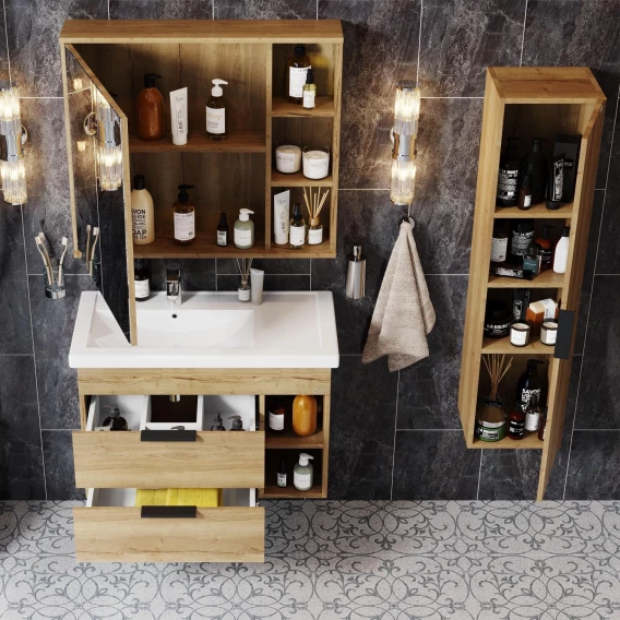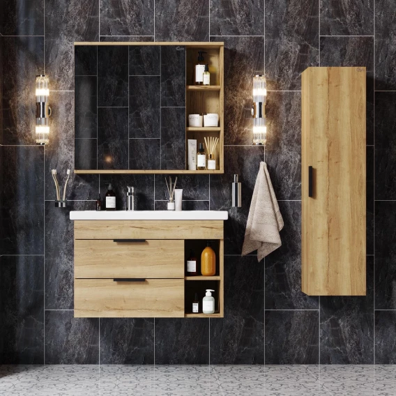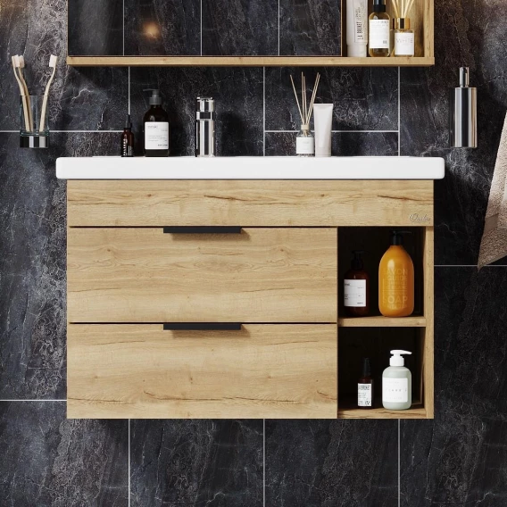Подвесная тумба для ванной комнаты Onika Легран 80 - это сочетание насыщенного древесного декора и благородства металла: роскошная текстура и натуральный цвет дуба дают теплоту, а матовые металлические ручки добавляют урбанизма и солидности.Тумба имеет два ящика, снабженные системой плавного закрывания. Нижний предназначен для больших предметов, а верхний, имеющий удобную систему организации пространства, - для мелких аксессуаров. Две открытые полки справа от ящиков служат дополнительным пространством для хранения.Тумба выполнена из ЛДСП, устойчивой к механическим воздействиям, перепадам температур и высокой влажности, при этом она надежно крепится к стене и не занимает место на полу, не создавая при этом сложностей в уборке помещения.Ручки и подвесы для крепления тумбы - в комплекте.