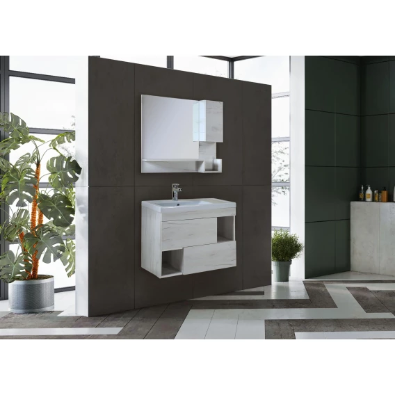 Подвесная тумба Onika Санторини 80 отражает актуальные тенденции в дизайне мебели для ванной комнаты: минимализм и геометрия фасадов, чёткость и лаконичность форм, отсутствие декора и стильный цвет белой древесины с текстурой дорогих пород.Два выдвижных ящика, оснащенные системой открывания push-to-open, внутри разделены на отсеки для удобной организации косметических средств и других аксессуаров. Две открытые полки по разным углам тумбы служат дополнительным пространством для хранения.Тумба выполнена из ЛДСП, устойчивой к механическим воздействиям, перепадам температур и высокой влажности, при этом она надежно крепится к стене и не занимает место на полу, не создавая при этом сложностей в уборке помещения.Подвесы для крепления тумбы - в комплекте.
