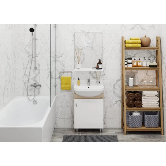 Комплект Onika ЭКО 3-в-1 - это идеальное сочетание минимализма, функциональности и цены.В комплект входит тумба, раковина и зеркало.Компактные габариты позволяют грамотно организовать небольшой санузел, а простой белый глянцевый фасад и корпус цвета дуба с роскошной текстурой гармонично впишется в интерьер любой ванной комнаты.Распашная дверца тумбы скрывает вместительное пространство для хранения, разделенное полкой.Полка на зеркале подойдет для размещения небольших аксессуаров.Раковина в комплекте - Santeri Акватон 52, изготовлена из 100% санитарного фарфора и отличается безупречной белизной.Тумба и зеркало выполнены из ЛДСП, устойчивой к механическим воздействиям, перепадам температур и высокой влажности.3 ножки (2 декоративных и 1 пластиковая), 1 ручка и подвесы для крепления зеркала - в комплекте.