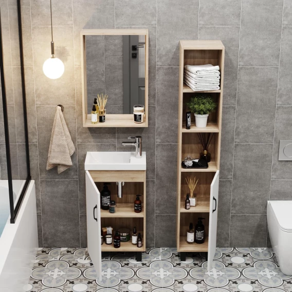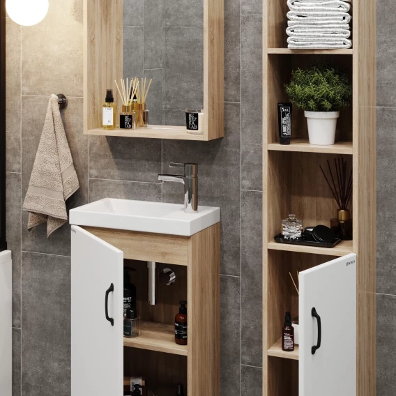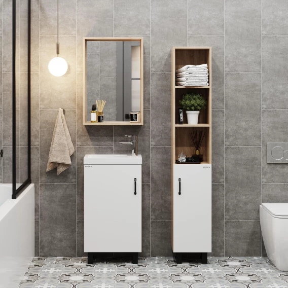 В тумбе Onika Тимбер 45 удачно сочетаются контрастные цвета и фактуры: белый матовый фасад с покрытием SoftTouch, корпус цвета дуба с роскошной текстурой, черная матовая металлическая фурнитура. Пространство за распашной дверцей, снабженной системой плавного закрывания, станет удобным местом для хранения различных бытовых принадлежностей.Корпус тумбы выполнен из ЛДСП, фасад - из ЛМДФ в пленке, устойчивых к механическим воздействиям, перепадам температур и высокой влажности.Черная металлическая ручка и 4 ножки (2 декоративных черных и 2 пластиковых) идут в комплекте с тумбой.